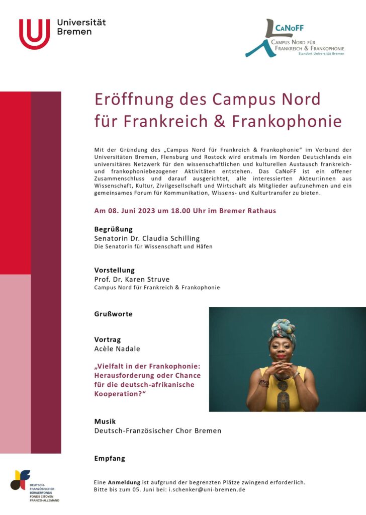 Qui sommes-nous? In Bremen wird der Standort von der AG Französische Literaturwissenschaft betreut und mit Leben gefüllt. Das Team begeistert die Arbeit mit und die Vermittlung von frankophonen Literaturen und ihren Kontexten. Gerne stecken wir die Bremer Szene damit an! Die CaNoFF-Mitglieder sind aus einem weite(re)n interdisziplinären Kontext: aus den Politik-, Kultur- oder Meereswissenschaften; es sind Akteur:innen aus dem deutsch-französischen Engagement in Bremen und umzu!
